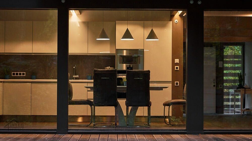 Большую часть дня в доме светло без использования осветительных приборов. Например, летом, когда световой день достигает двенадцати часов, свет необходимо включать только в ванных комнатах, и то, если в них нет окон. Кроме того, высокий процент остекления значительно сэкономит вам бюджет на покупку светильников. Обычно их нужно намного меньше, чем в доме с обычными окнами.
