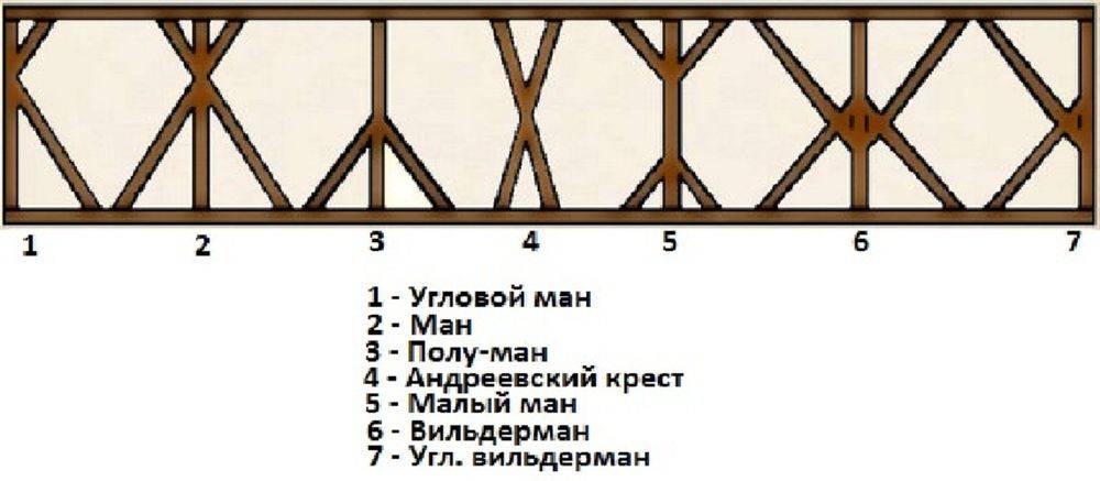 Разновидностями декоративных элементов являются Андреевский крест, швабская женщина, ман, угловой ман, полуман, малый ман, Вильдерман, угловой Вильдерман. Главные фигуры устанавливают по центру стены, а угловые разновидности – по бокам. По старинным традициям эти конструктивные фрагменты несут не только декоративную, но и определенную символическую нагрузку.
