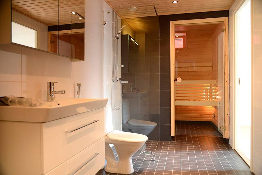 Здесь имеется вода (горячая и холодная), система вентиляции и канализация – все, что нужно для банных процедур. Вдобавок обустройство аккуратной сауны в ванной комнате не нуждается в перепланировании квартиры, поэтому согласование с РЭУ не потребуется.
