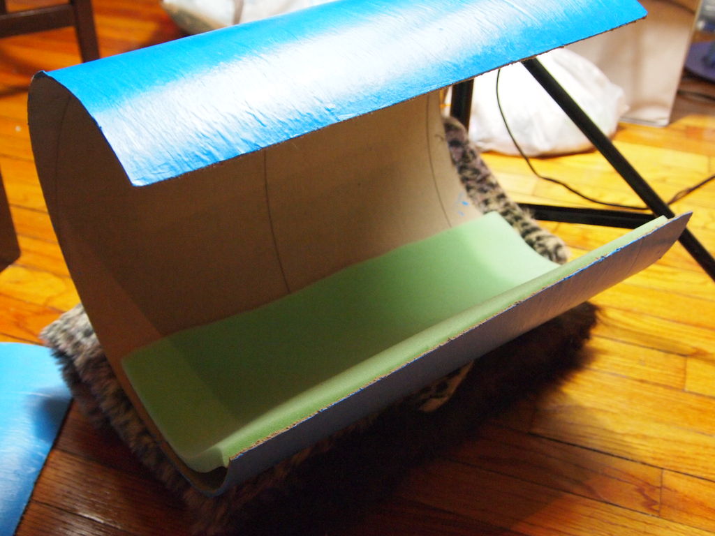 После того, как домик, оклееный мягкой материей, подсохнет, приступайте к финальной стадии — обивке кошачьего домикам. Сначала сделайте выкройку с небольшим запасом и аккуратно подклейте внутреннюю часть домика. Постарайтесь делать меньше швов. Лучше всего закрывать швы внахлест с большим запасом, так вы сможете обойтись без работы с иголкой и ниткой.