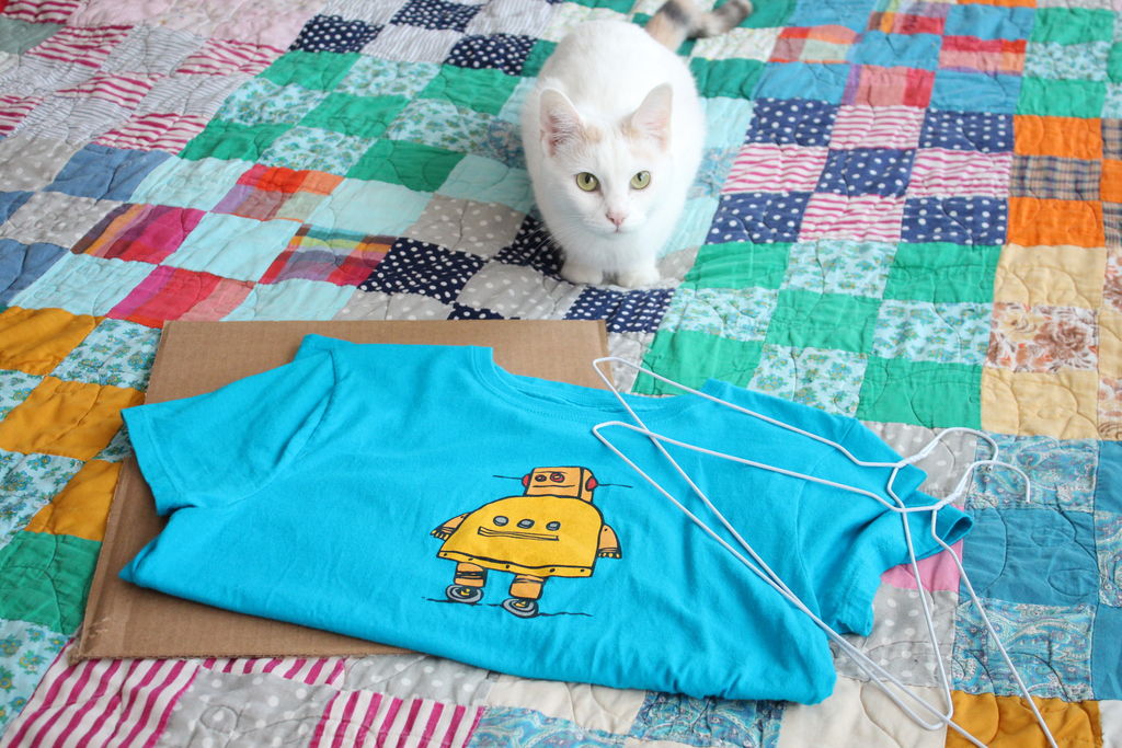 Итак, приготовьте: футболку, плотный квадратный картон, две проволочные вешалки, клейкую ленту, булавки, плоскогубцы.
