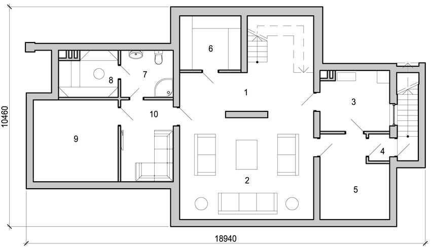 План подвального этажа, где 1 – холл, 2 – комната отдыха, 3 – топочно-постирочная, 4 – тамбур, 5 – кладовая, 6 – кладовая, 7 – санузел, 8 – сауна, 9 – спортзал, 10 – терраса.