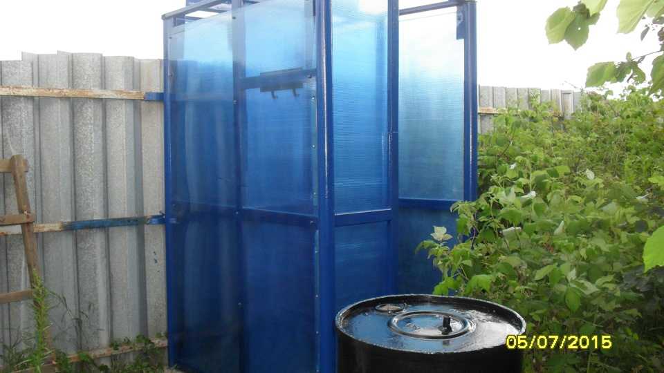 С появлением на строительном рынке поликарбоната все больше домашних мастеров используют его для сооружения летнего душа. Благодаря разнообразию цветов этого материала, кабинка получается яркой и стильной. Иногда совмещают дачный душ и туалет под одной крышей.