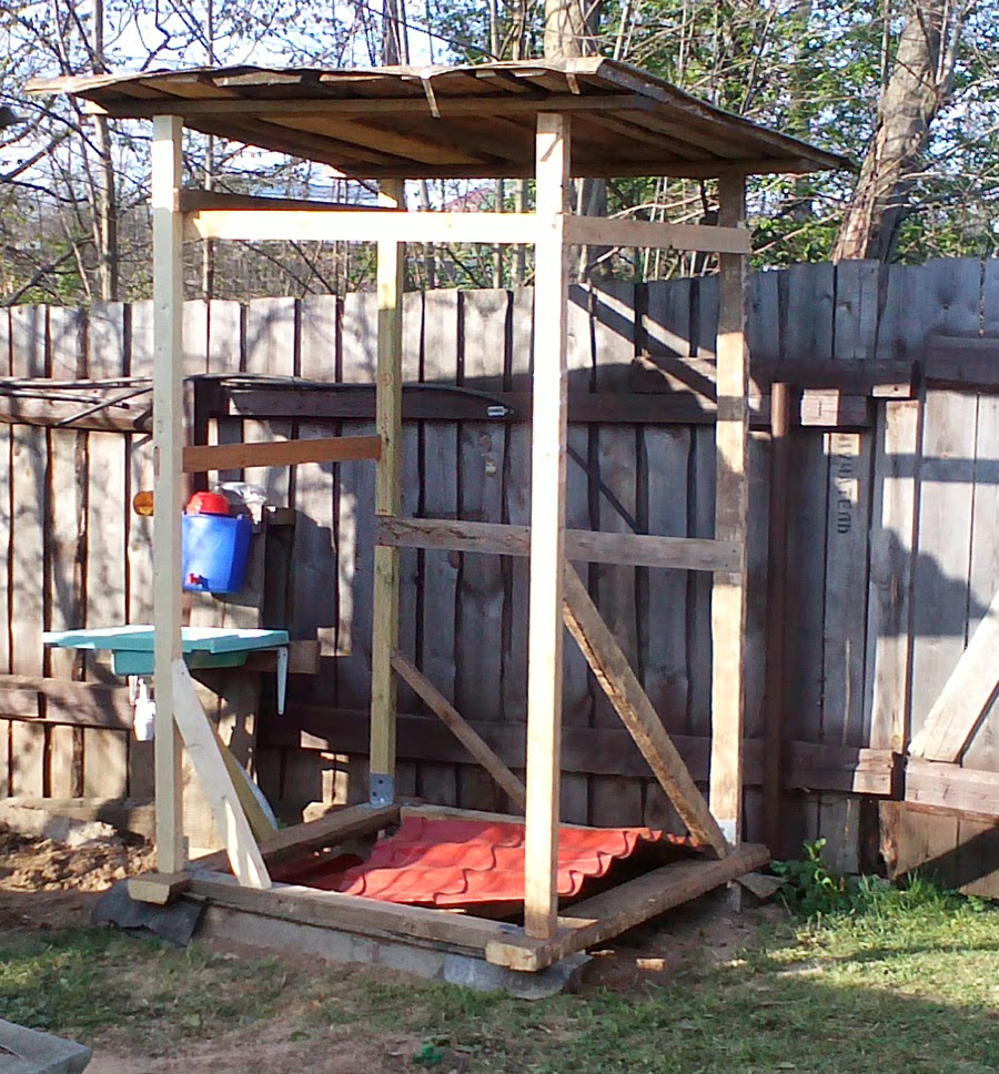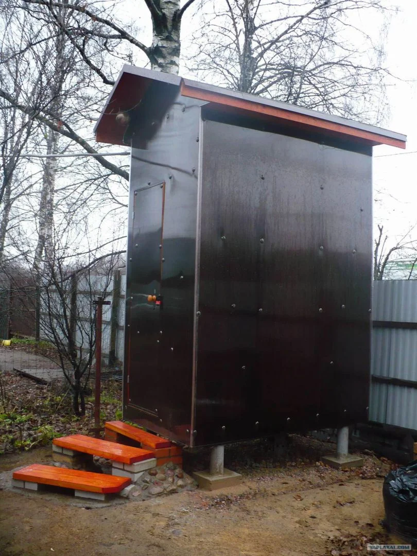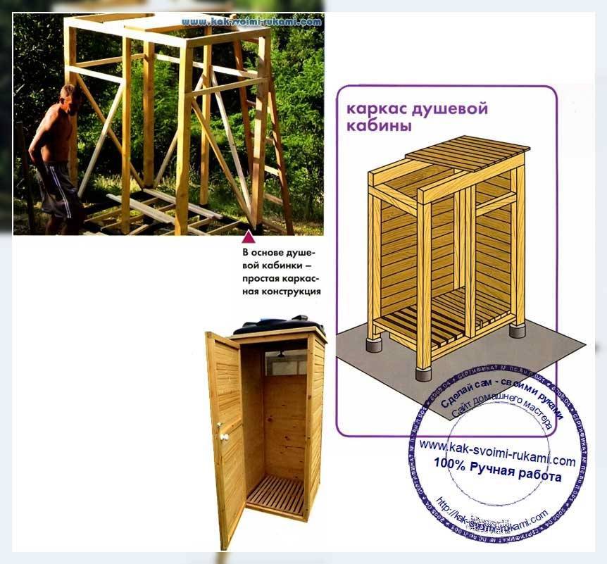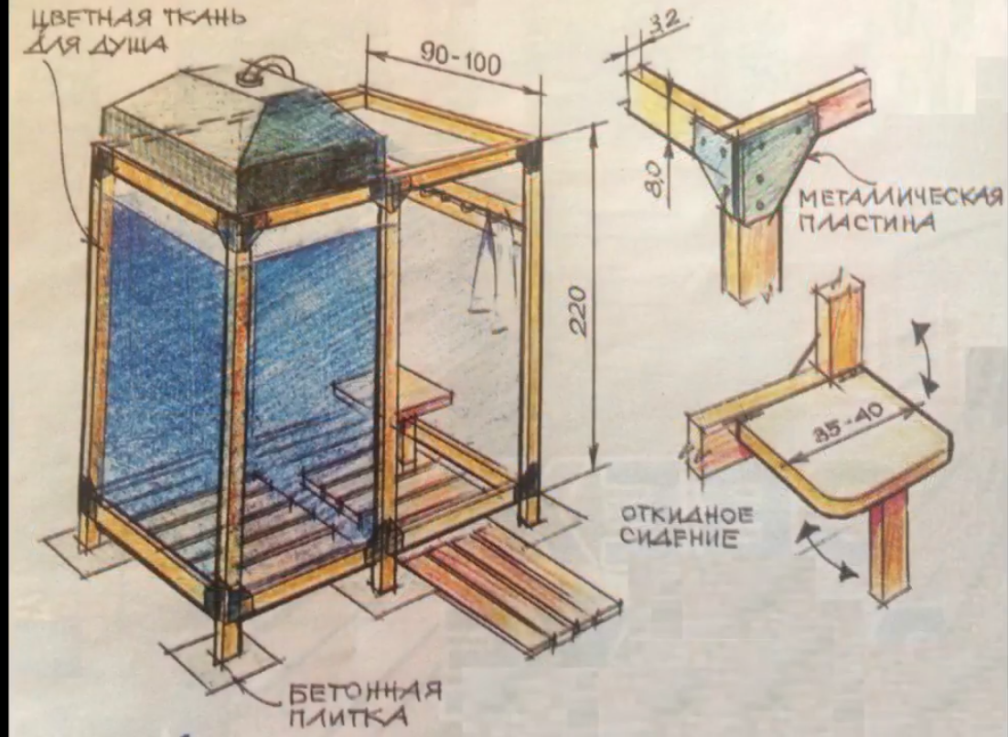 - Более сложная конструкция представляет собой небольшую кабинку из подручных материалов, к примеру, натянутого на металлический или деревянный каркас брезента, с выведенным наружу баком, который может нагреваться на солнце. Баки преимущественно используются пластиковые и металлические.