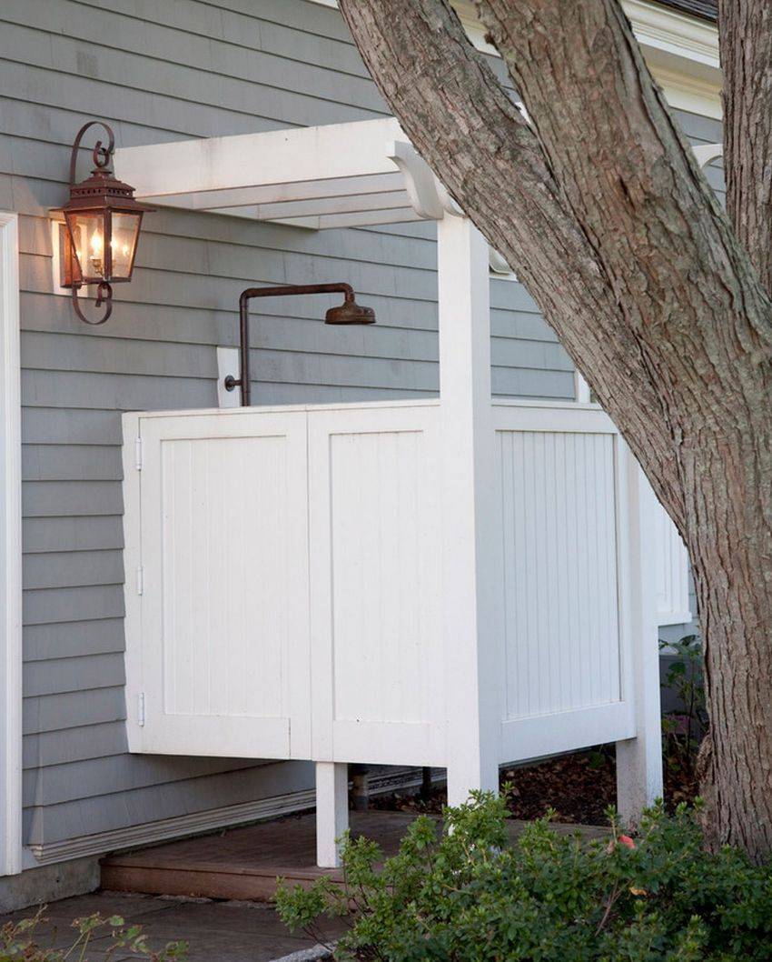 Выберите место для душа. Это должно быть ровное место, желательно с хорошим стоком воды. Определите высоту душа и вкопайте опорные столбы в землю, используя уровень для того, чтобы они стояли ровно. Прикрепите доски к опорным столбам, образуя каркас душа. Возможна обшивка стен досками для большей конфиденциальности. Прикрепите крышу к верхней части каркаса, чтобы защититься от прямых солнечных лучей. Протяните шланг или трубу к месту установки душевой лейки. Если есть возможность, подключите к водопроводу, если нет – к емкости с водой. Покрасьте или обработайте деревянные элементы пропиткой, чтобы защитить их от влаги.
