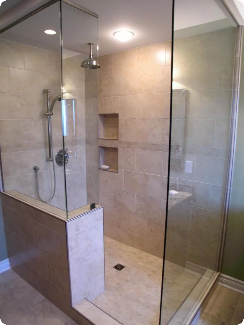Оборудовать такую душевую из плитки без поддона в квартире гораздо проще. Перегружать перекрытие не придется. Стяжка займет место, отведенное для подиума. Мелкий кафель позволяет провести отделку даже сложного волнистого рельефа. При необходимости можно заказать у производителей герметичные дверцы и направляющие нужного размера.