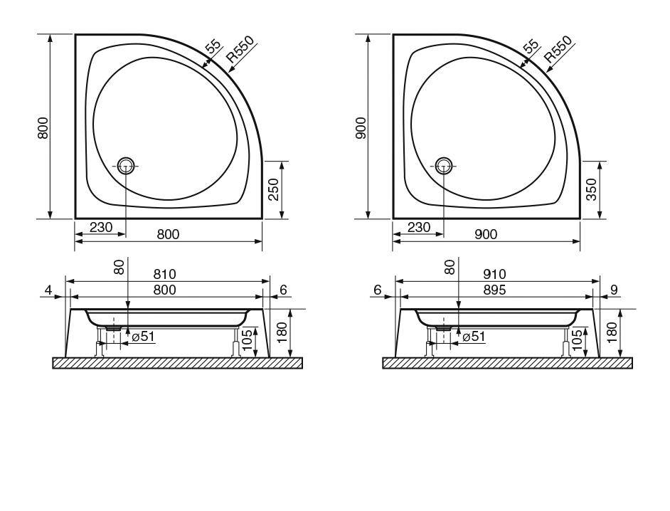 - в плане размеры подиума не должны быть меньше аналогичных размеров кабинки.