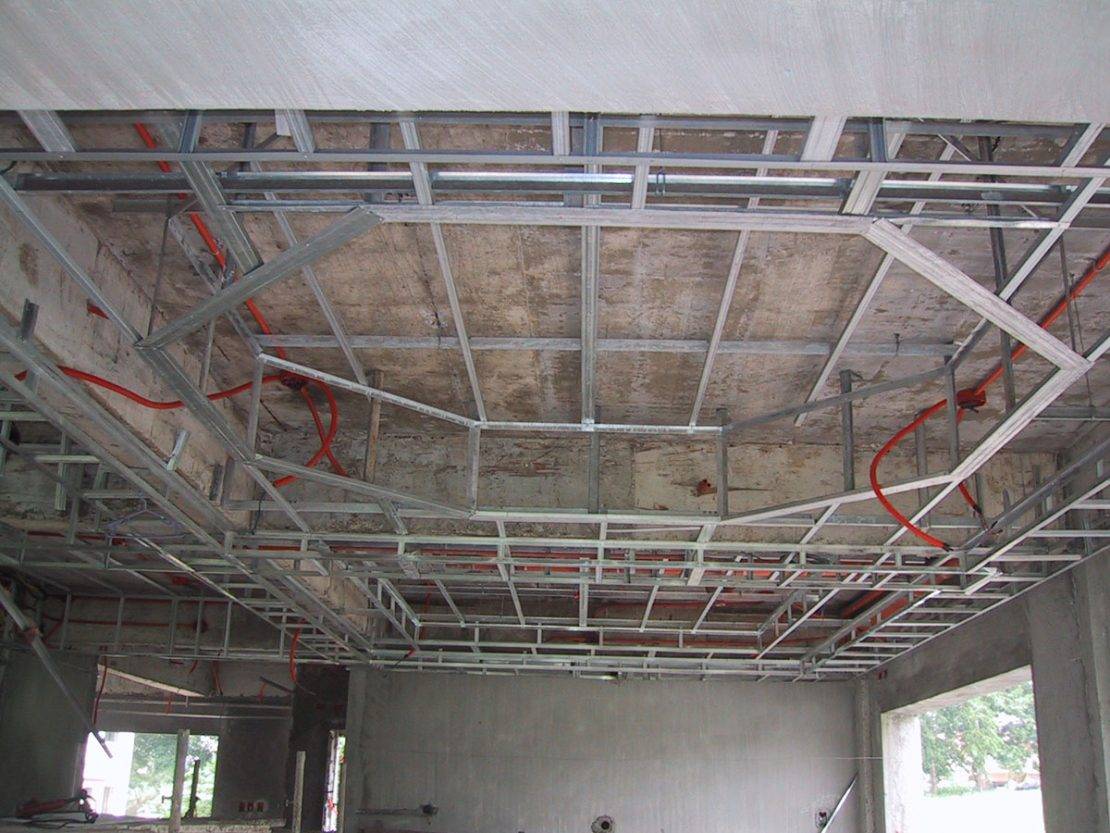 - Далее на изготовленном каркасе сооружается обрешетка нижних ярусов. Она может крепиться непосредственно к каркасу или закрепляться на базовом потолке с помощью подвесов.