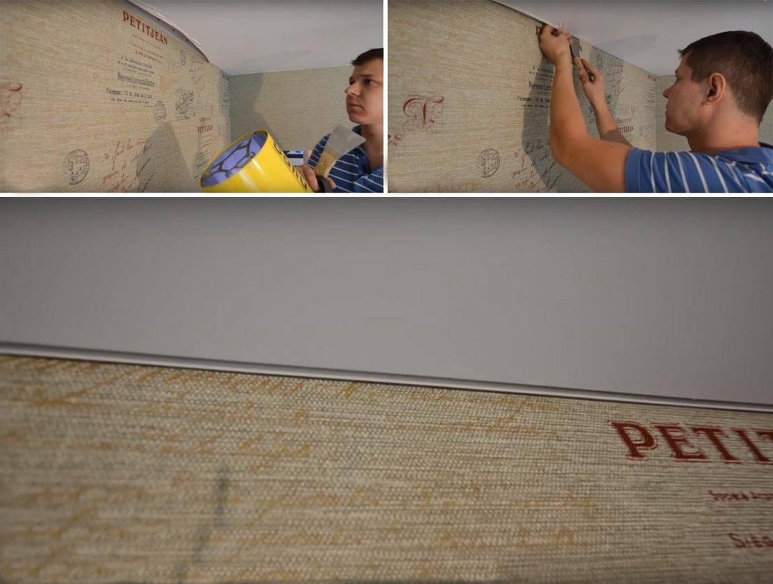 Многие специалисты вообще не берутся за демонтаж такого потолка, так как извлечь штапики, не повредив полотна, очень сложно. Приходится работать только на внешней стороне. Для этого необходимо взять оставшиеся после монтажа кусочки ткани, вырезать фрагмент узора, соответствующий испорченному, нанести клей и наложить на поверхность. Интенсивно придавливать и растирать ни в коем случае нельзя.