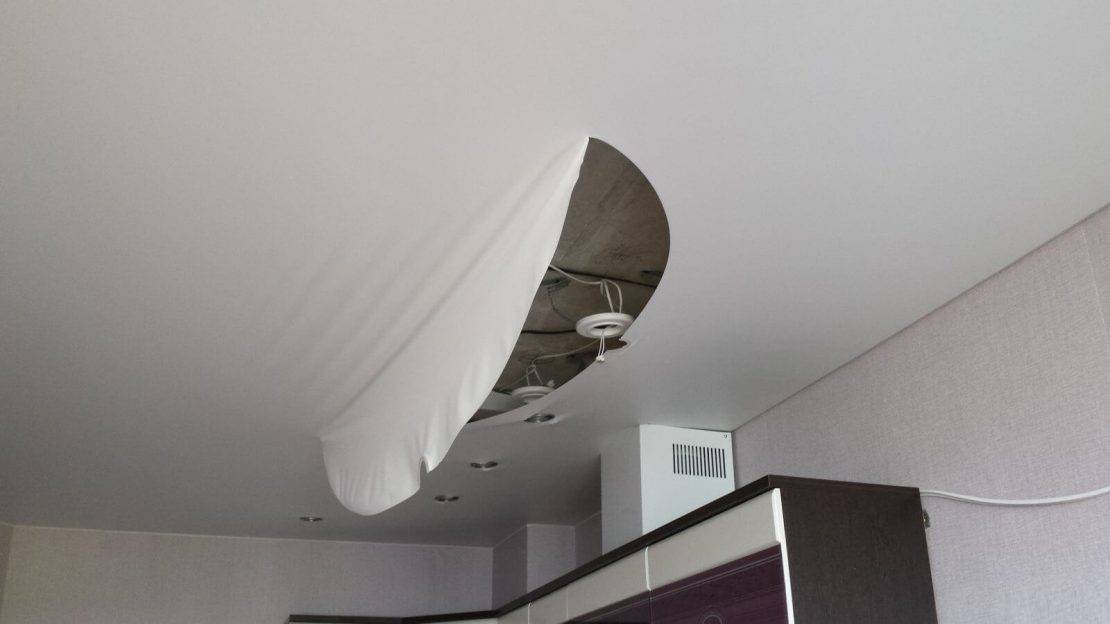 При затоплении соседями сверху, натянутая пленка практически неизбежно провиснет. Ее можно натянуть заново, хотя, и потребуется приезд мастера с тепловой пушкой. Если же натянута не ПВХ плёнка, а ткань, то на ней, после затопления, появляются некрасивые пятна, которые, к сожалению, не удастся удалить полностью. Такое покрытие нужно заменить.