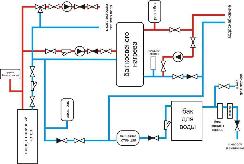 - Насос — перед котлом, на участке с наиболее низкой температурой;
