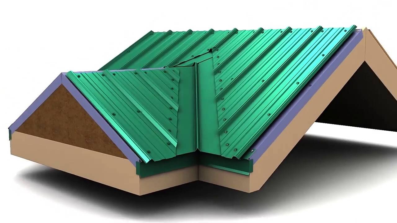 При использовании этого покрытия для кровли каркасная рама в участке ендовы кровли не непрерывная, так как зазор в 15 см есть между 2-мя соседними рейками (каждая по собственную сторону от стыка). Собственно сюда и ложатся разжелобки на кровле. Их монтаж выполняется в пару листов, которые ложатся по очереди, начинаясь снизу. Первый ложится в одном уровне с краем кровли и прибивается к каркасу. Второй лист закрывает первый внахлест на 15 см.