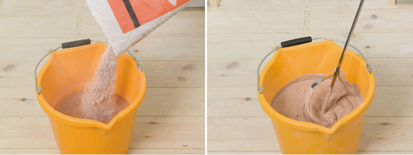 Основных способа замеса всего два. Первый способ: в чистую и сухую емкость засыпается сухая шпаклевка. Затем в нужной пропорции добавляется вода и все тщательно перемешивается. Пару минут смесь настаивается, а потом снова перемешивается. При таком способе уменьшается риск образования комков, которые крайне нежелательны.