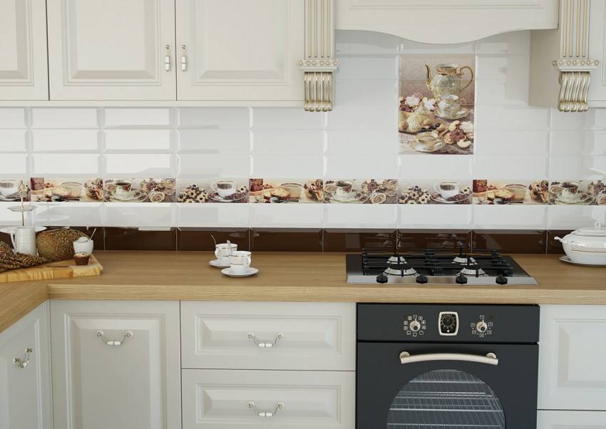 Керамическая плитка для изготовления кухонного фартука – вариант не новый и один из самых практичных.