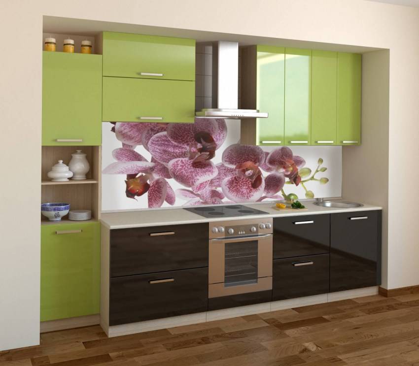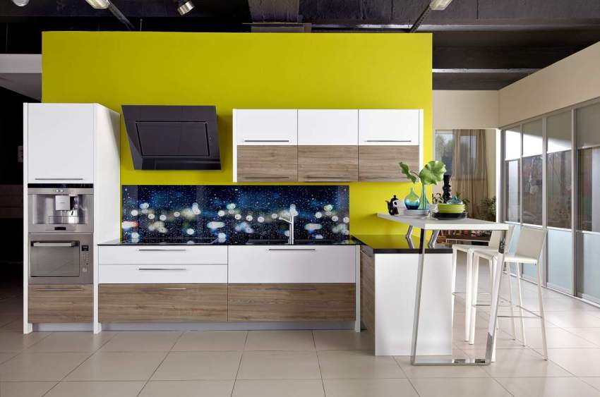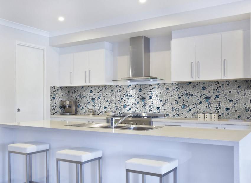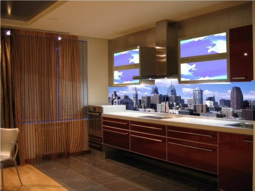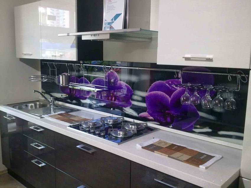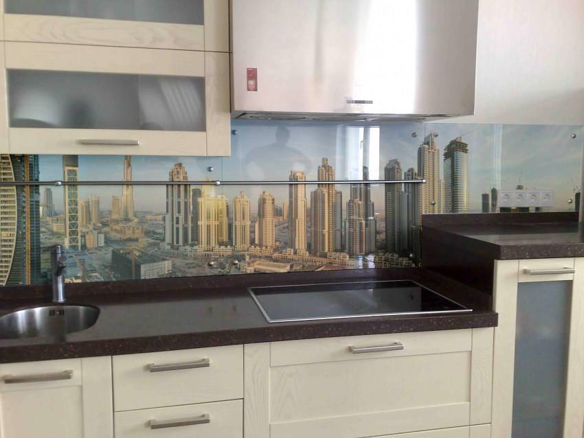 На кухне используют прочное закаленное стекло толщиной 6 и 8 мм с разным дизайном: прозрачным, окрашенным, тонированным, матированным и декорированным фотопечатью.
