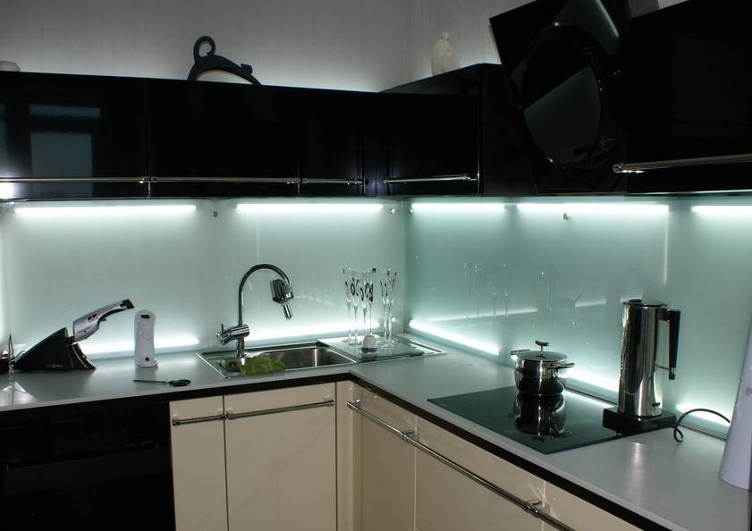 Выбрав светлый стеклянный фартук на кухню (как на фото), вы зрительно расширите маленькое пространство