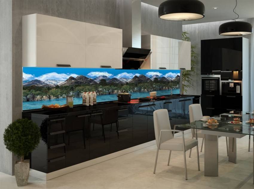 Однотонная панель молочного цвета отлично впишется в белый гарнитур в сочетании с темной техникой. На белой кухне будет отлично смотреться фотопечать с изображением ночного города. Чисто черная панель придаст строгости интерьеру, а яркий фартук — поднимет настроение. Изображение цветов создадут на кухне весеннюю атмосферу, а морские пейзажи будут располагать к отдыху.