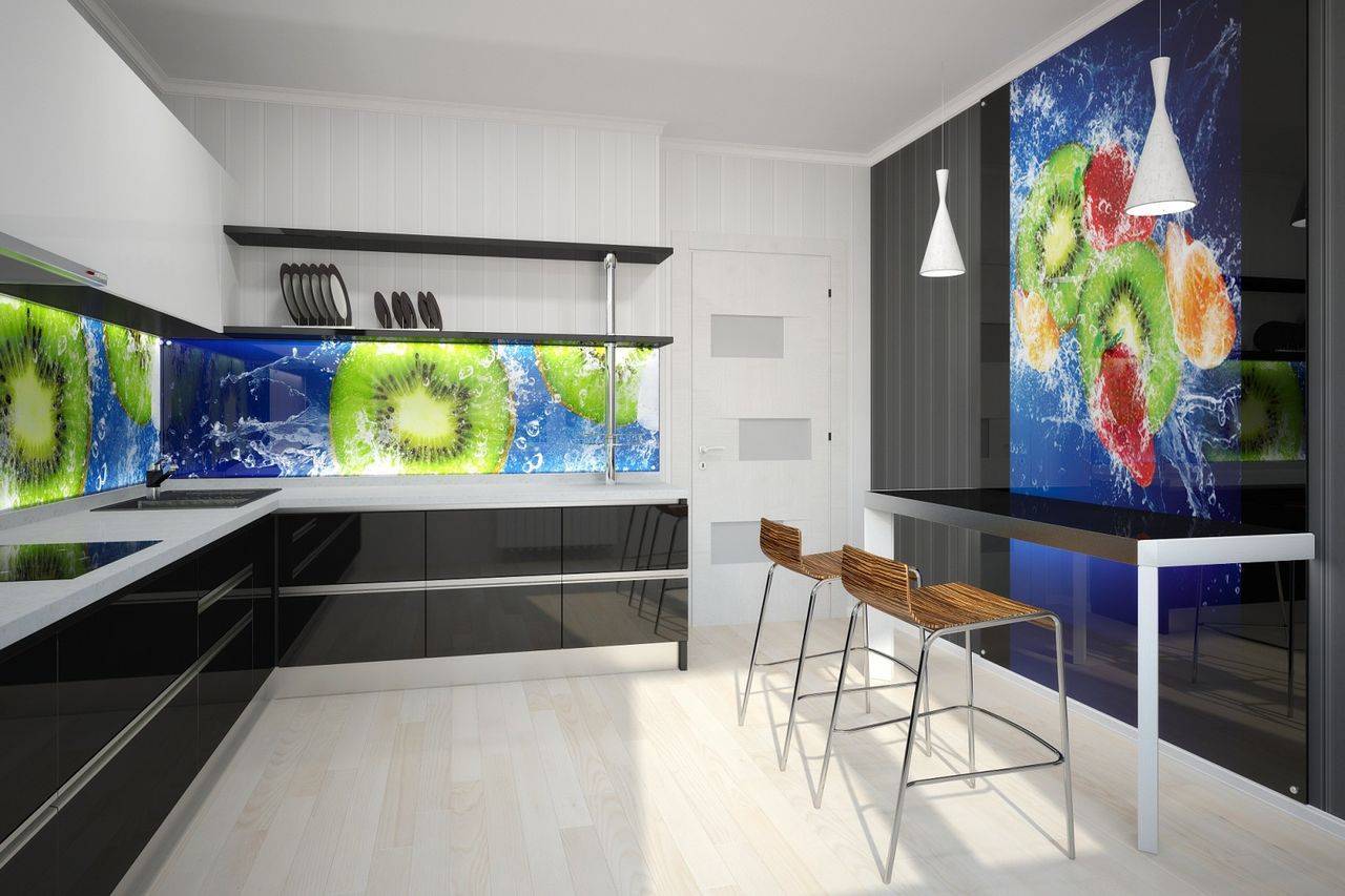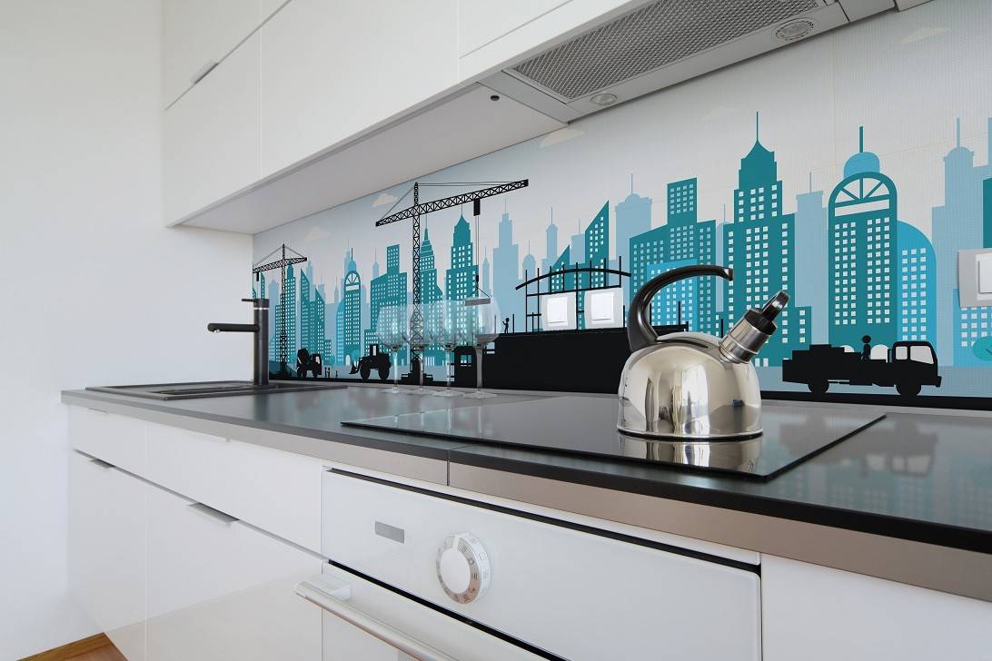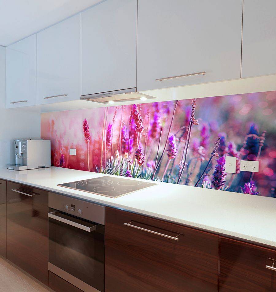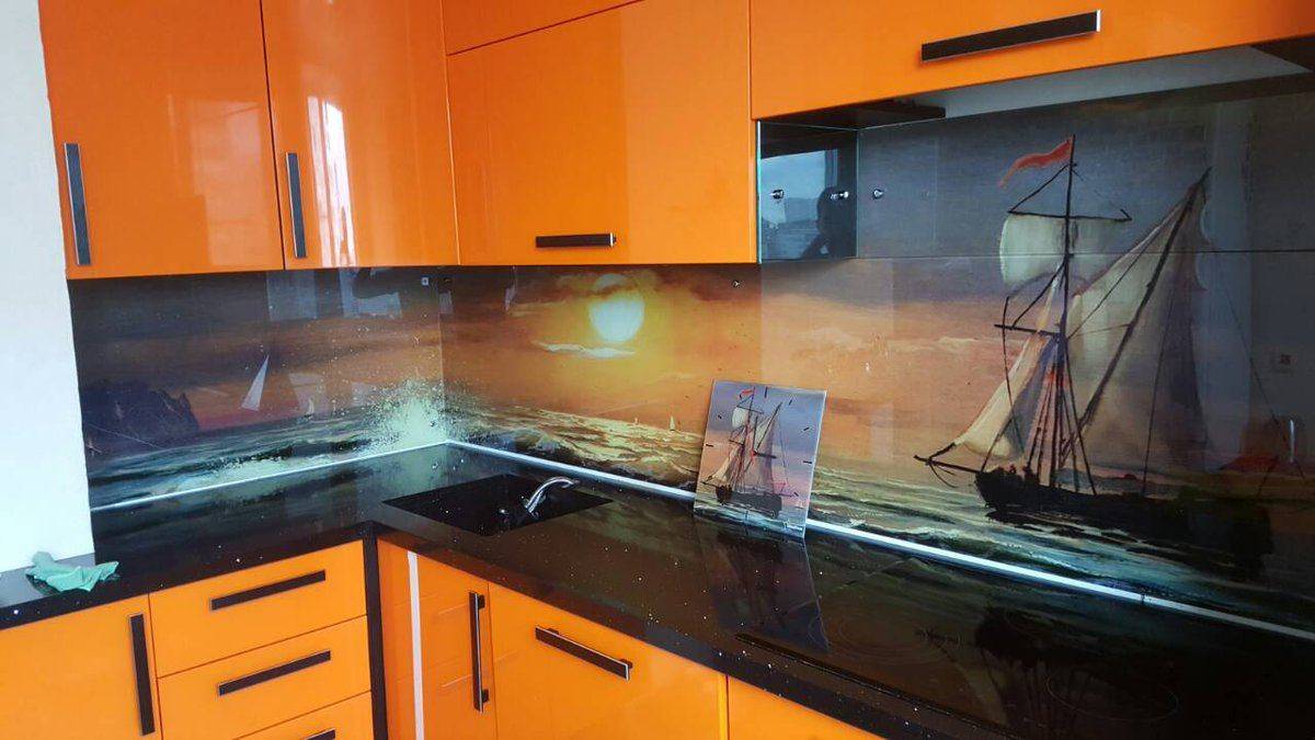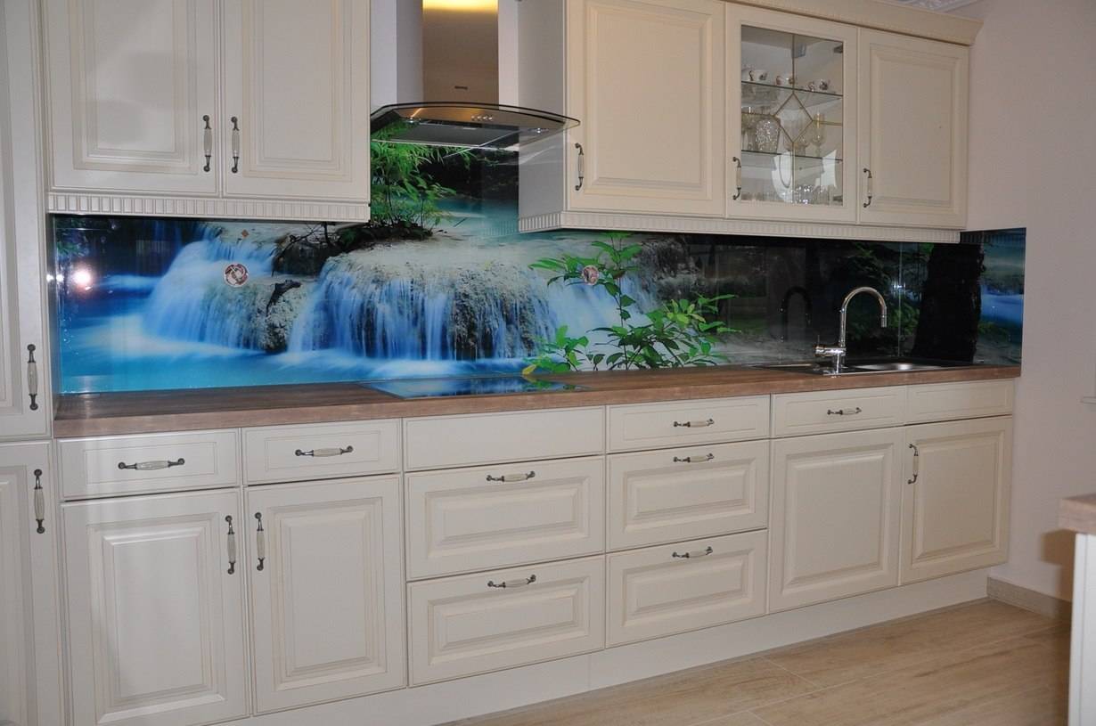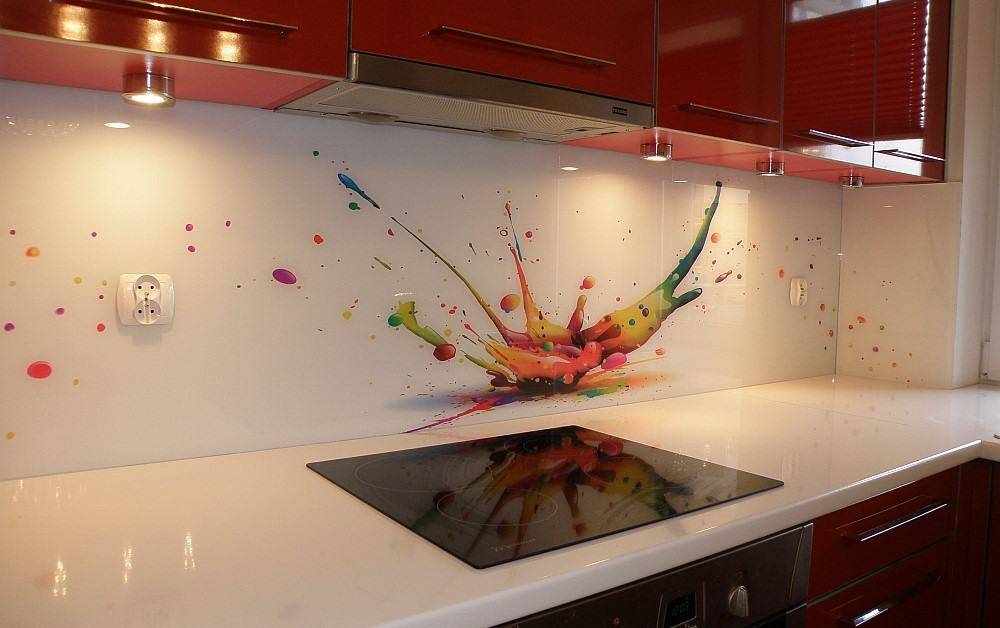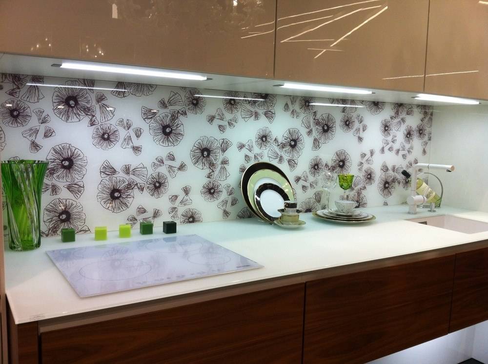 - Фартуки узор – это уникальная возможность для пользовательских причине передник. Существуют две основные технологии печати: полный цвет УФ-печати и виниловой пленки с рисунком. Первый вариант намного прочнее и долговечнее, кроме того, этот способ позволяет разместить на стекле 3D рисунки. Второй способ более бюджетный, но наклеенная на стекло пленка со временем отслаивается и выгорает.