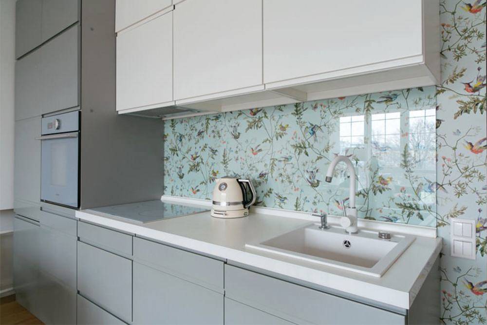 Обои, особенно бумажные без защитного покрытия — тоже далеко не самый лучший материал для кухонного фартука. И если их испачкать, то очистить и привести в порядок уж точно нормально не получится — придется полностью переделывать фартук. Потому лучше не использовать бумажные обои в этой части кухни и или же закрыть их стеклом.