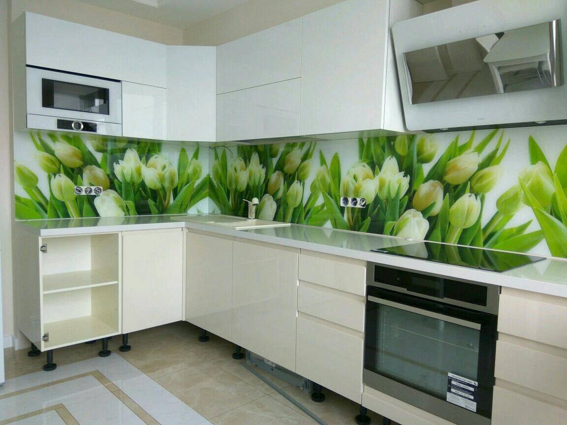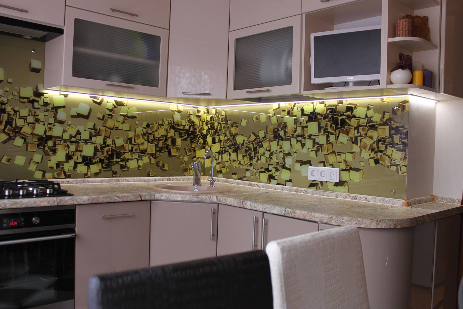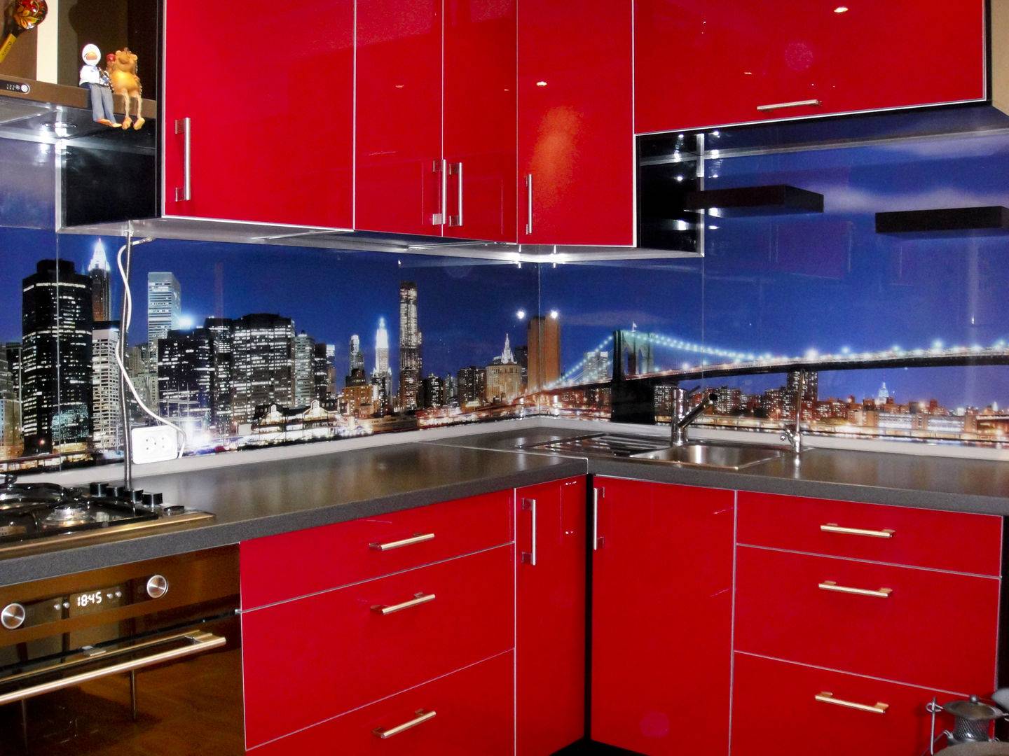 При изготовлении между обычными стеклянными пластами заливается специальный полимер, который окрашивается после отверждения. Такой фартук монтируется без швов, неприхотлив в уходе и хорошо сочетается с акриловыми фасадами. Но учти, что впишется он в основном только в современные кухни.