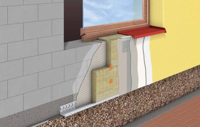 После этого утеплитель дополнительно фиксируется при помощи полимерных дюбелей. Желательно выбирать те, у которых наиболее широкие шляпки. Отливы окон, как и углы, закрепляются перфорированными уголками из алюминия.