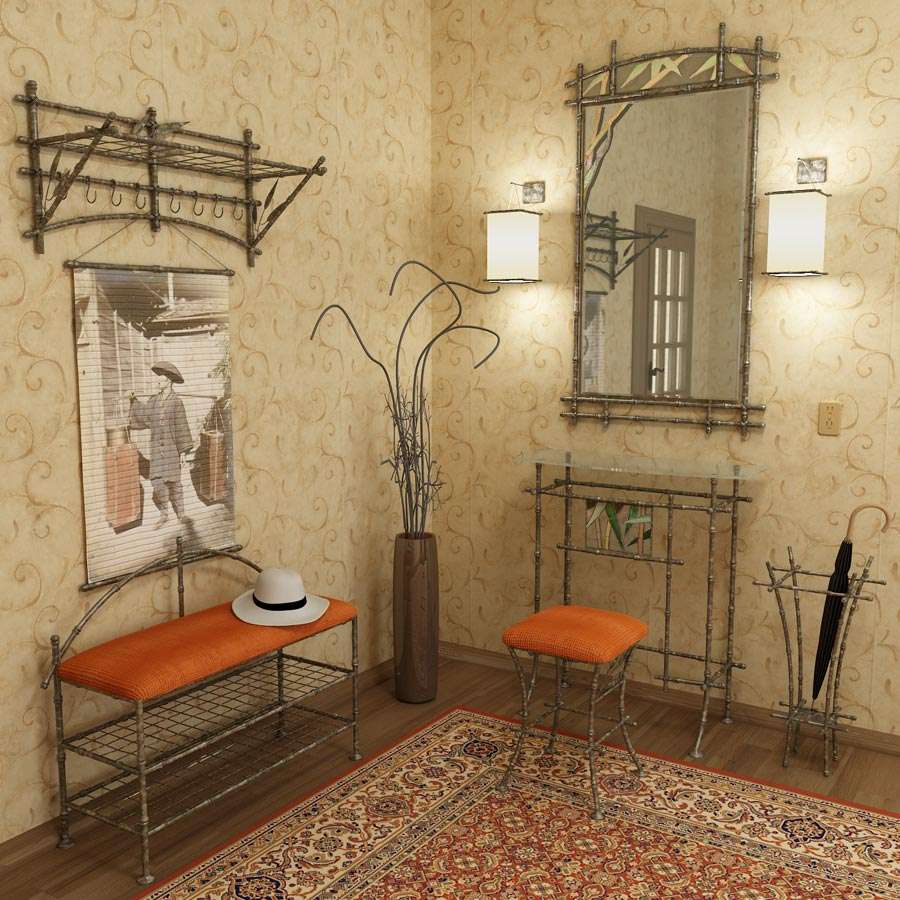 - При желании создают и монтируют целый комплект мебели из ивовой лозы: зеркало в оплетке, под зеркальным полотном ключницу органайзер и этажерку для обуви, а на противоположной стене — плетеную вешалку.