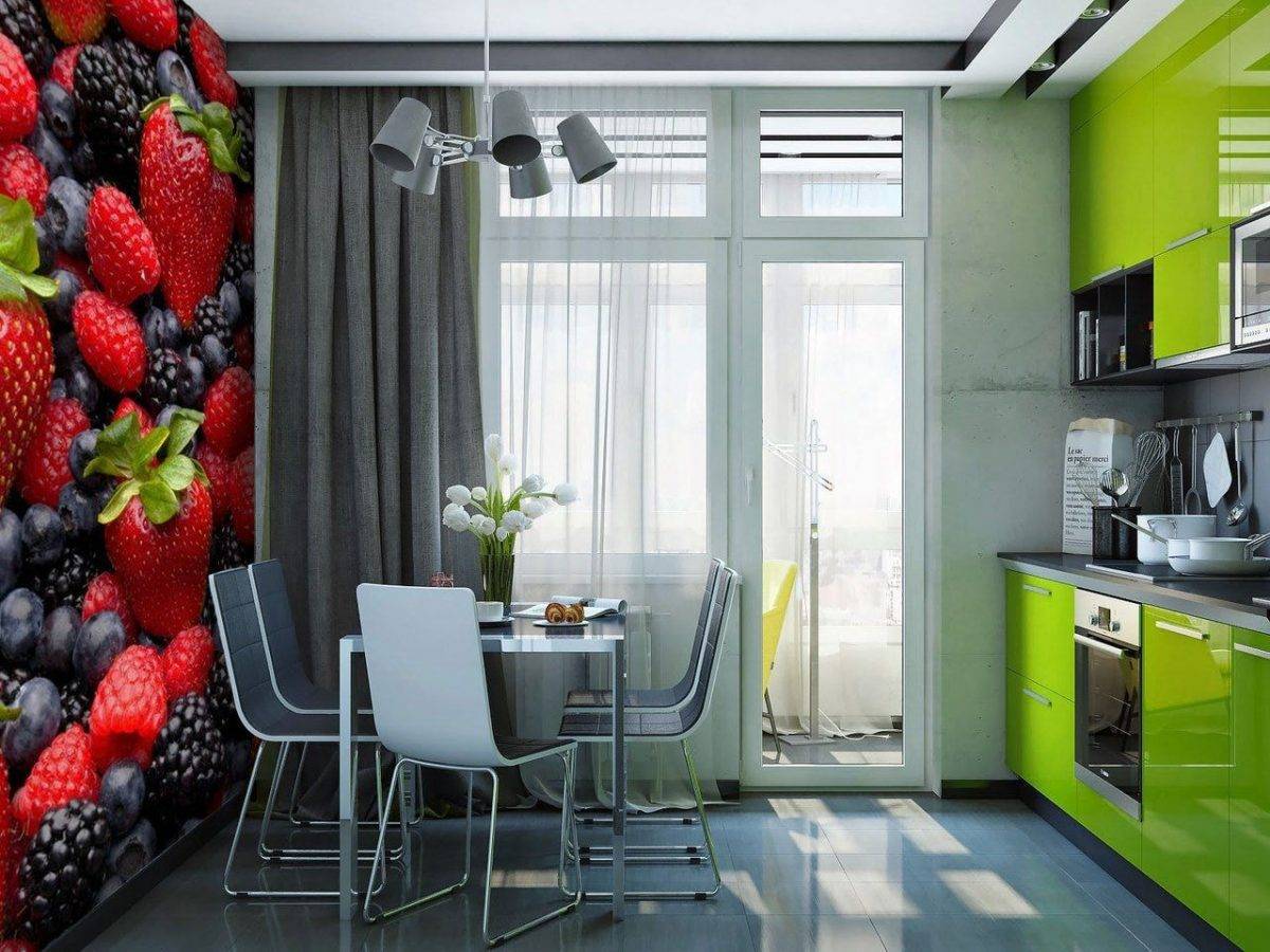 Изображения высоток и башен на обоях помогут визуально приподнять потолки. Для узкой кухни актуальным будет использование сплошной фотографии-полотна (предпочтение отдается морской тематике).