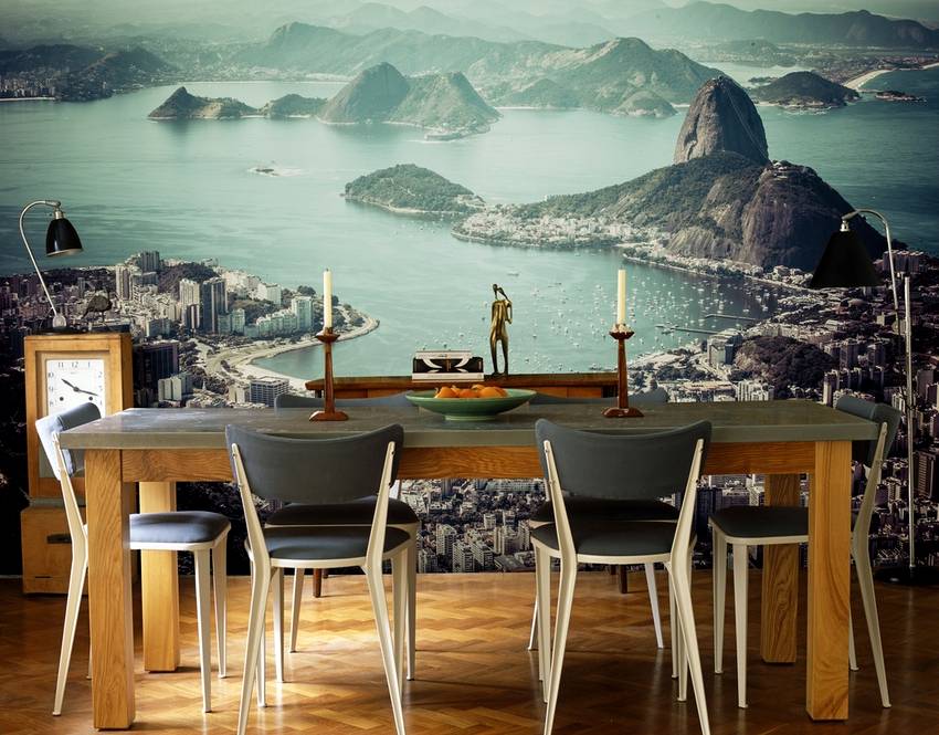- Компактное помещение будет визуально смотреться больше, если на фотообоях присутствуют оттенки изумруда, бирюзы или сирени. Кроме того психологи утверждают, что такие цвета уменьшают аппетит. Зрительный простор создает также полотно панорамного типа. Например, оригинальный вариант – воспользоваться фотообоями лес;