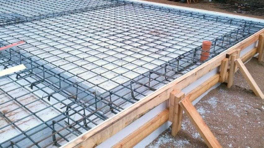 Процесс начинается со сборки армирующего каркаса (размер меньше плиты по плоскостям на 3 см). Это две сетки, соединенные поперечными прутьями за счет прямоугольных хомутов. Если планируется отдельная заливка ленты, то на нее должен быть оформлен отвод на дополнительную обвязку.
