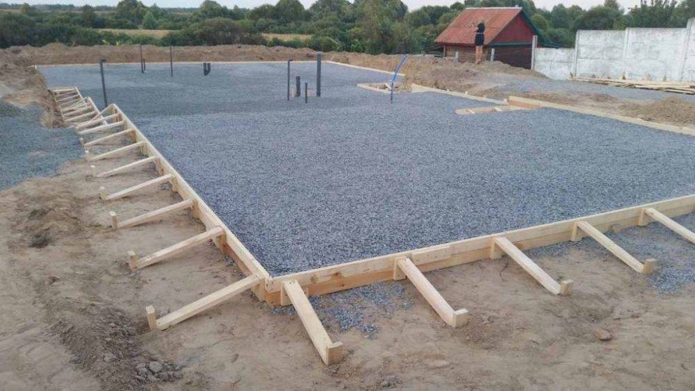 Второй вид менее затратный и легко возводимый. Потребуется создать подушку под монолит из песка или щебня толщиной до 30 см. Потом приступают к заливке железобетонного основания.