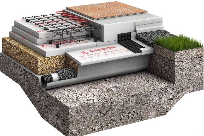 - теплоизоляционный. Он сформирован из листов экструдированного пенополистирола. Слой утеплителя укладывается в нижнем уровне основы, утепляя фундаментную подошву;