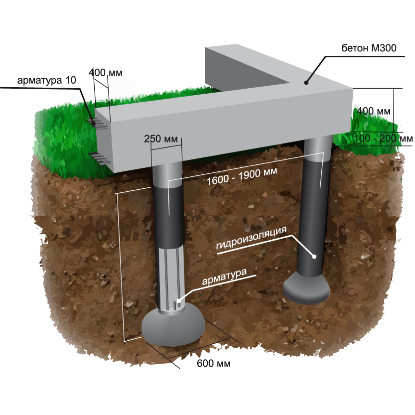Ростверк использовать или высокий — приподнятый на 150 мм над грунтом, или делать свайно-ленточный фундамент с мелкозаглубленной лентой. Второй вариант используют для тяжелых зданий, передать вес которых посредством свай невозможно, тогда делают ленту, которая увеличивает площадь передачи.