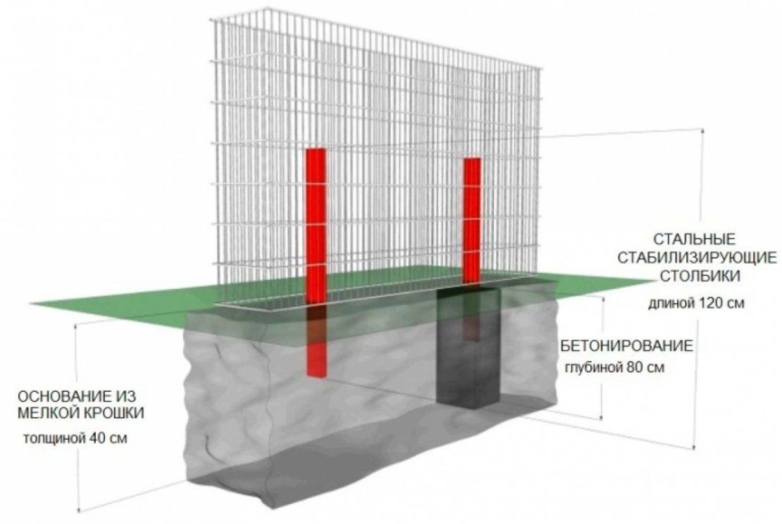 Под забор выкладывается фундамент из габионов, монтаж простой, а эксплуатация длительная, материалы экологически чистые.