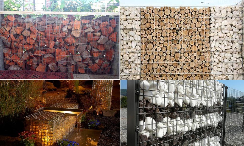 Декоративные габионы можно наполнять не только камнями: подойдет кирпичная крошка, терракоторые кашпо, куски черепицы, искусственные материалы. Существуют даже габионы из дерева, наполненные отдельными ветками или слэбами.