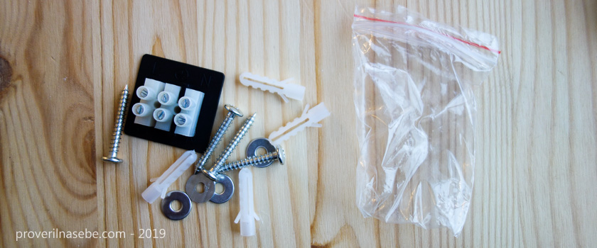 И в том и в другом комплекте имелись и шурупы для крепления и электрическая колодка для присоединения изделий к электрической сети: