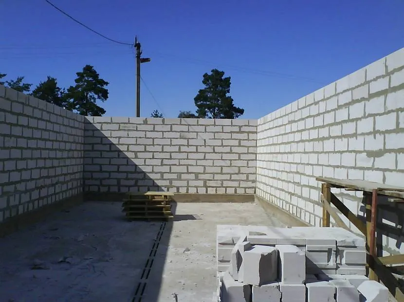 На следующем этапе возводятся стены из газобетона. Блоки укладывают обычно на специальный клеевой раствор. Для придания конструкции большей надежности и долговечности применяется усиление стен армированием. Строительство должно осуществляться в строгом соответствии с проектной документацией.