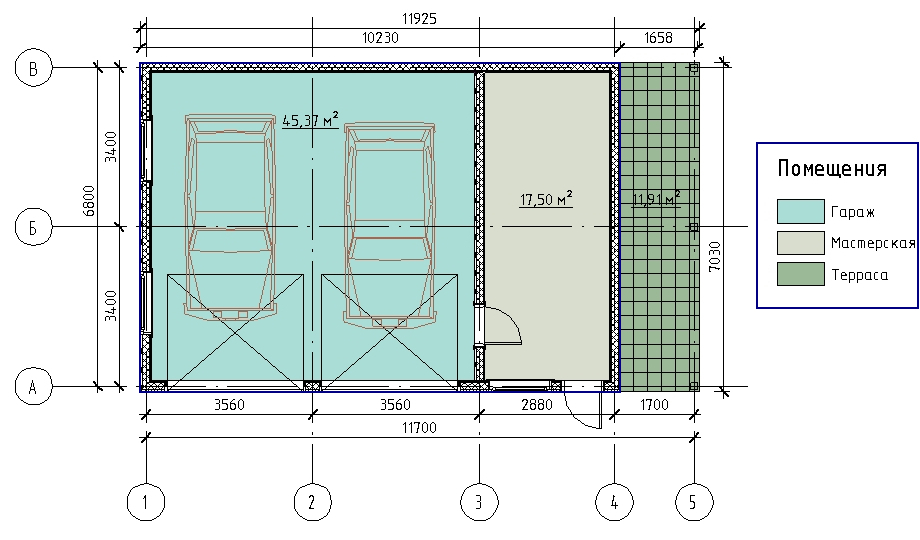 Первый проект — помещение с гаражом на две машины с небольшой мастерской в 17,5 м2, которую можно использовать для столярных или слесарных дел, либо для хранения важных инструментов. По плану в мастерской не предусмотрено окно, если оно необходимо, следует его добавить в чертеж. Справа от входа в гараж предлагается построить узкую террасу с размерами 1,7 на 7 метров.