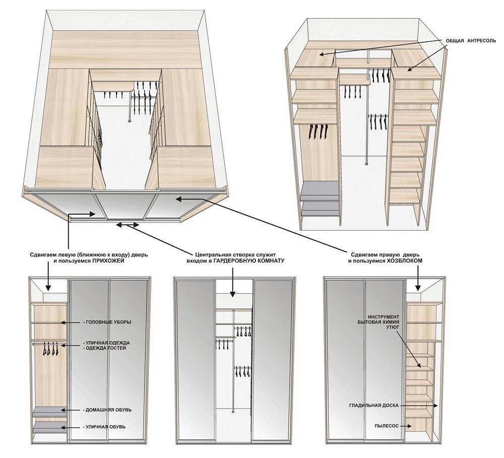Проектирование пространства делают исходя из объемов и размера вещей. Раздвижные системы позволяют плотнее заполнять пространство. Основные виды конструкций.