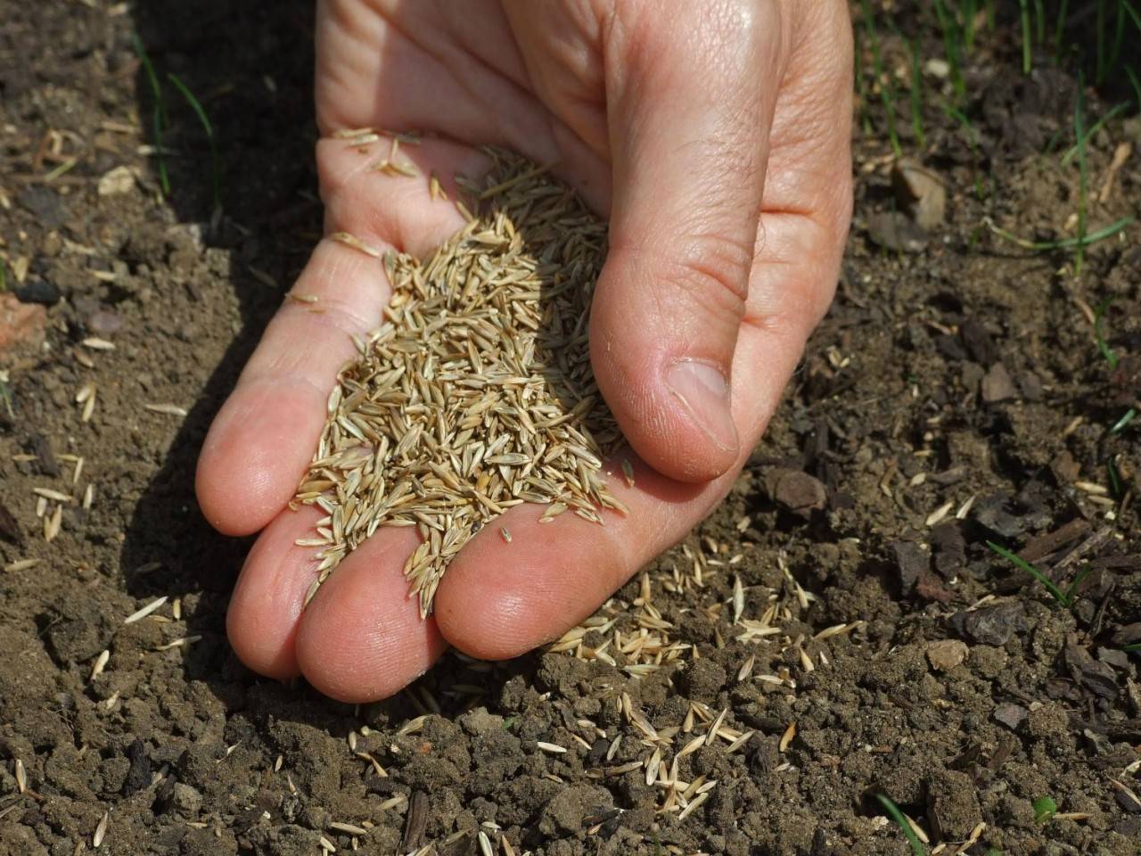 Этот способ прост и не требует особых навыков. Достаточно взять семена в руку и рассыпать крест-накрест – первую часть в одну сторону, вторую — в другую, перпендикулярно. Ручной посев позволяет добраться до труднодоступных мест вблизи бордюров, краев дорожек и заборов. Однако это может привести к неравномерному распределению семян.