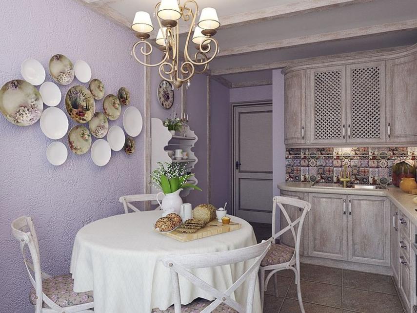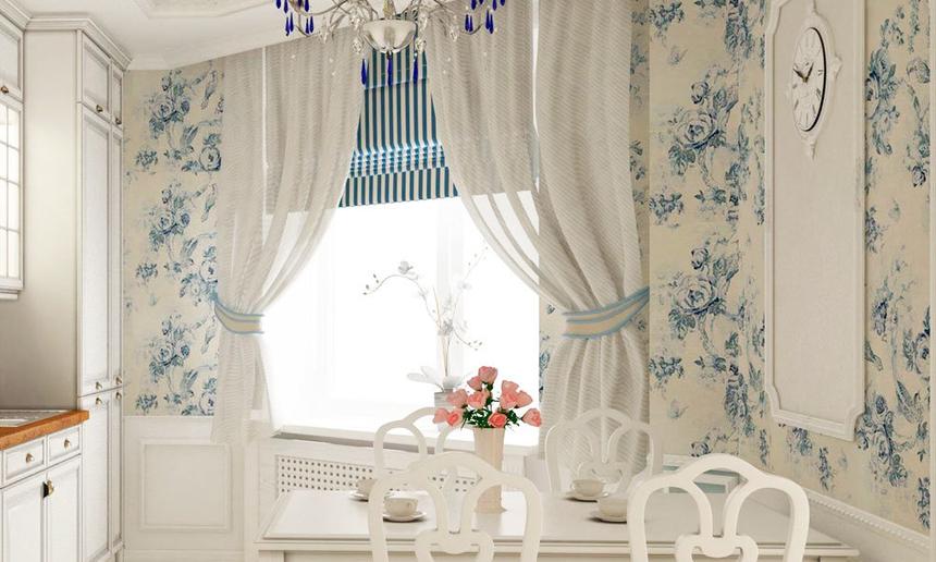 Также допустимо применять плитку, но она больше подходит для кухонь с санузлами. При создании интерьера в стиле современного прованса можно оклеить стены обоями – однотонными, декорированными цветочными узорами или полосками.