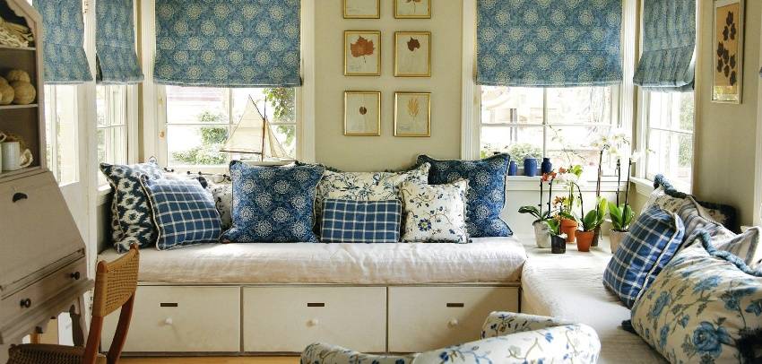 - Гостиная в стиле прованс имеет, как правило, большие окна. Их украшают шторами из легких тканей. Например, ситца, сатина, льна или грубого хлопка.
