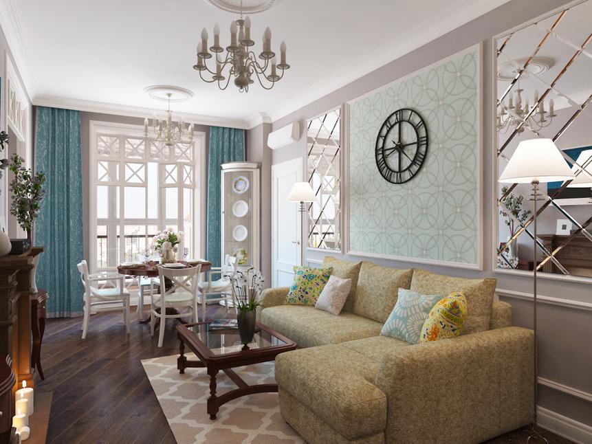 - применение сдержанной и мягкой основной цветовой палитры. Обычно используются оттенки бежевого, песочного, кремового, молочного и белого цветов, а также приглушенные лавандовые, бирюзовые, голубые и зеленые тона. В стиль гостиной могут гармонично вписаться и другие более теплые краски, но преобладать должны свежие и ненавязчивые оттенки;
