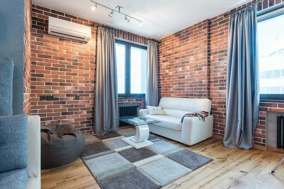 Гостиная или салон. Используя кирпичную кладку в салоне, можно получить креативный интерьер.