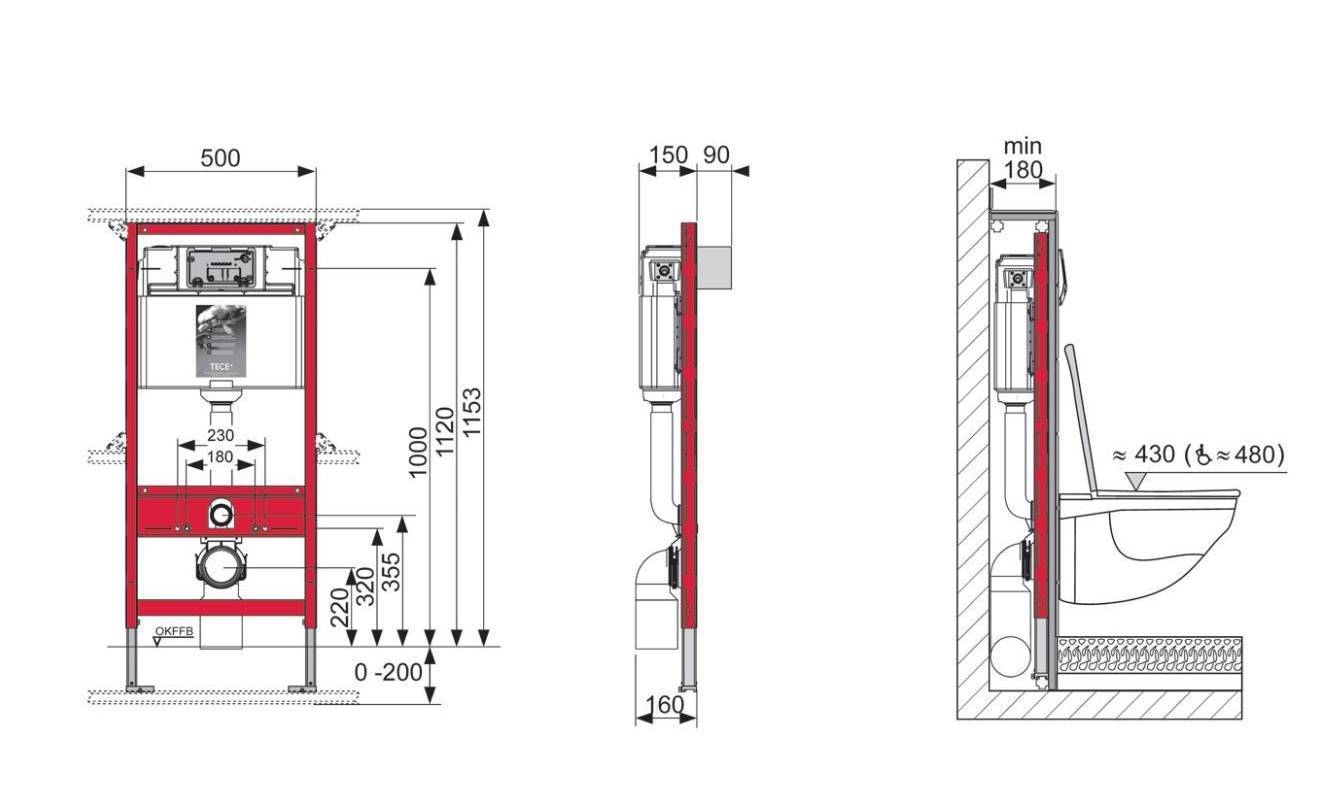 Ширина инсталляции для унитаза не зависит от ее типа. Рамные и блочные стандартные системы имеют одинаковые параметры 500-600 мм. Этого расстояния вполне достаточно для того, чтобы поместить внутрь каркаса смывной бачок.