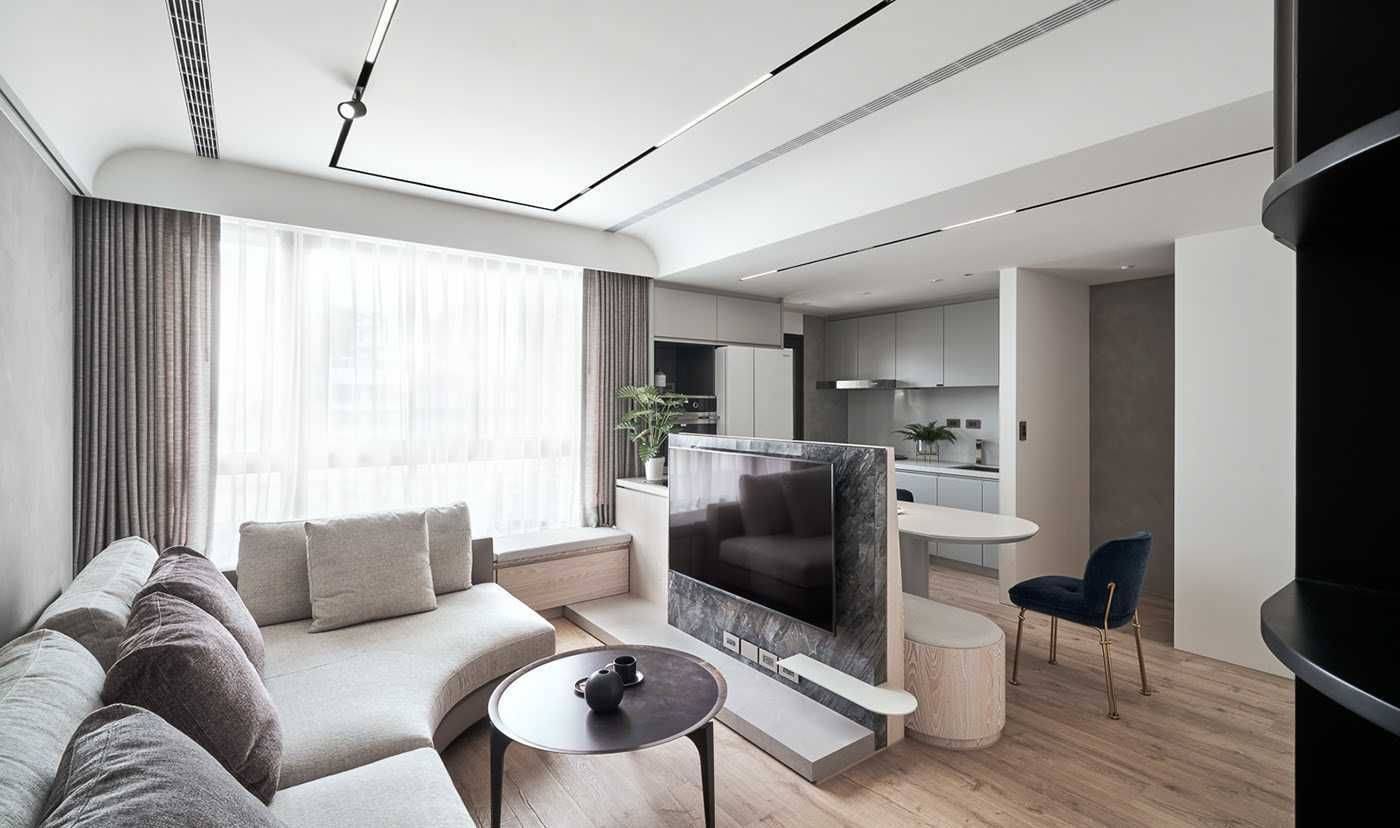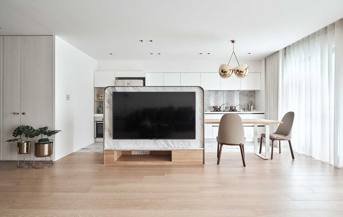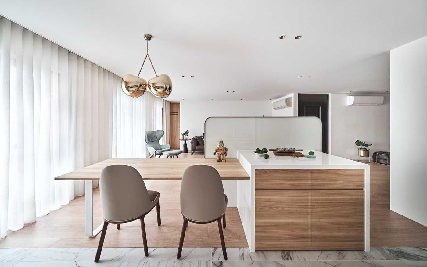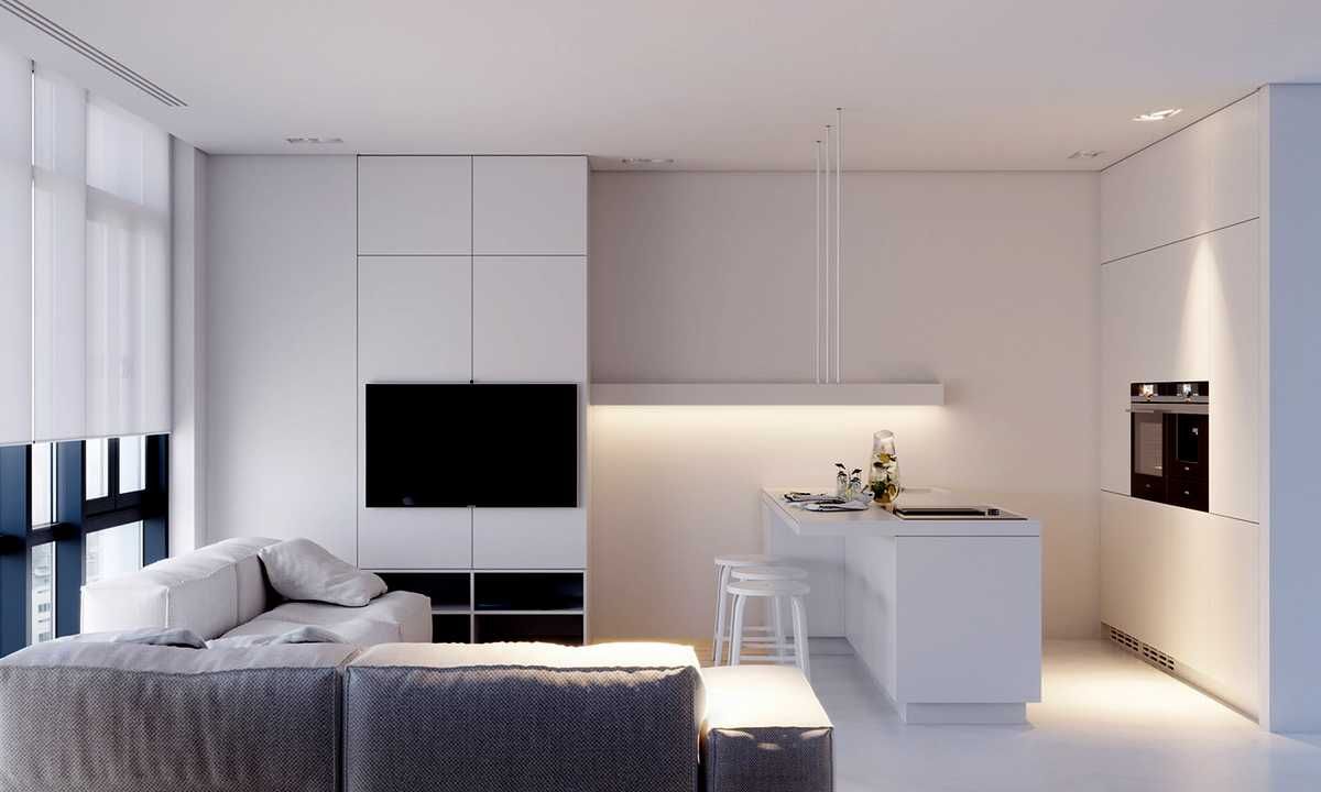 Интерьер комнаты в стиле минимализм, разработанный украинской студией Z.Design, выполнен в абсолютно белом цвете. Даже несмотря на то, что кухонный остров является явным разделителем, он всё равно воспринимается как часть единого пространства. Благодаря цвету всё помещение выглядит целостным.