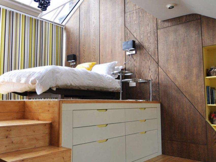 Подходит для счастливых обладателей помещений с высокими потолками. Само собой, спальное место будет размещаться под самым потолком, а для доступа к нему придется построить лестницу. Плюсов у такого решения много: увеличивается полезная площадь, не нужно дополнительно заморачиваться с ширмами или занавесками, гарантировано уединение в любое время суток.