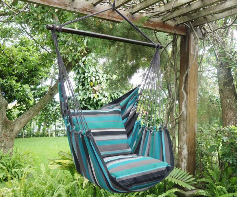 переносные – изделия с компактными размерами и облегченным весом. Эти характеристики позволяют не только перемещать качели по участку, но и складывать их в машину для перевозки в другое место на время отдыха. Как правило, закрепление таких изделий осуществляется на ветку дерева или же на предварительно изготовленную опору.