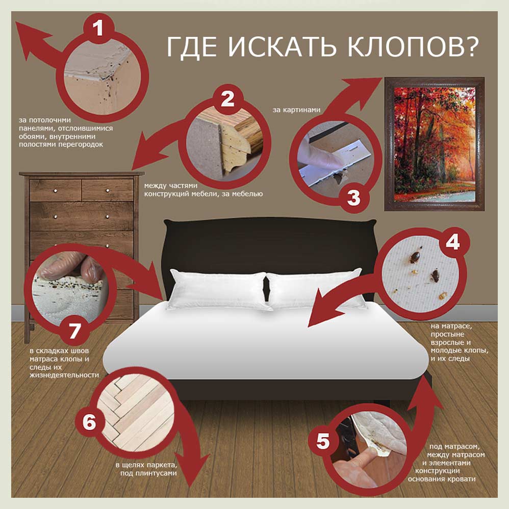 Обитают клопы не в самих постелях, а в матрасах, щелях деревянной мебели, мягкой мебели, внутри подушек и в толще одеял.