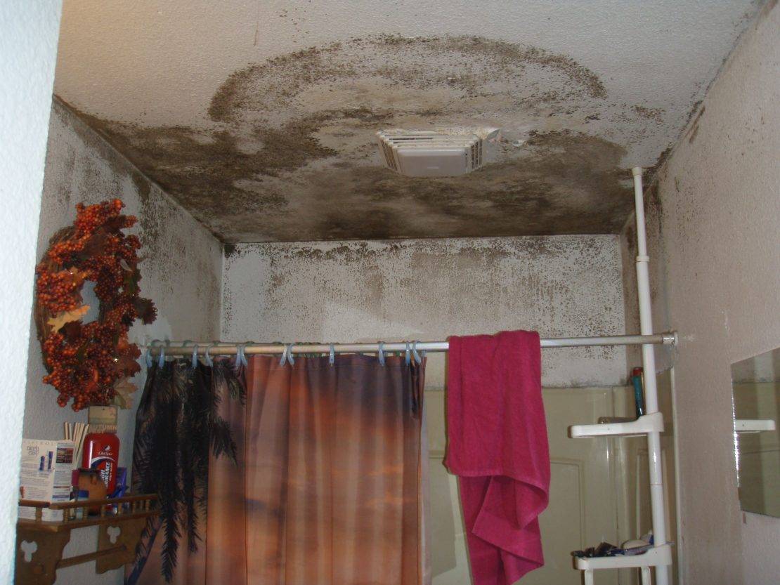 - Если в частном доме протекает крыша, то перекрытие в ванной тоже может быть постоянно влажным. Из-за этого здесь поселяются колонии плесневых грибов.