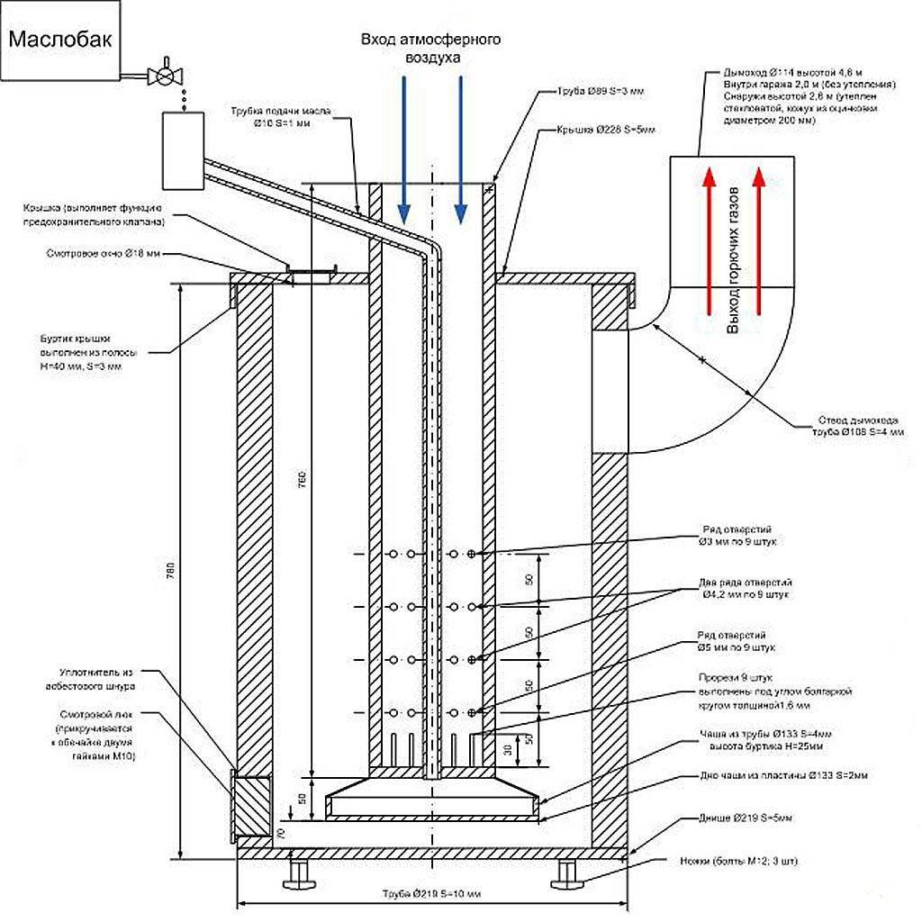 - Печь на отработке. Несколько сложнее в изготовлении, чем буржуйка. В качестве горючего в такой печке используется отработанное масло, которое очень дешево. И, так как сама идея получения печки из газобаллона вызвана желанием сберечь финансовые средства путем альтернативного применения отработанного материала, такая печка позволит не только сэкономить на материале оболочки, но и постоянно экономить на топливе. Так как сгорает не только масло, но и его пары, отходов от использования печи практически нет. Однако, из-за высокой пожароопасности и токсичности самого горючего такая печь не подходит для использования в жилых помещениях;
